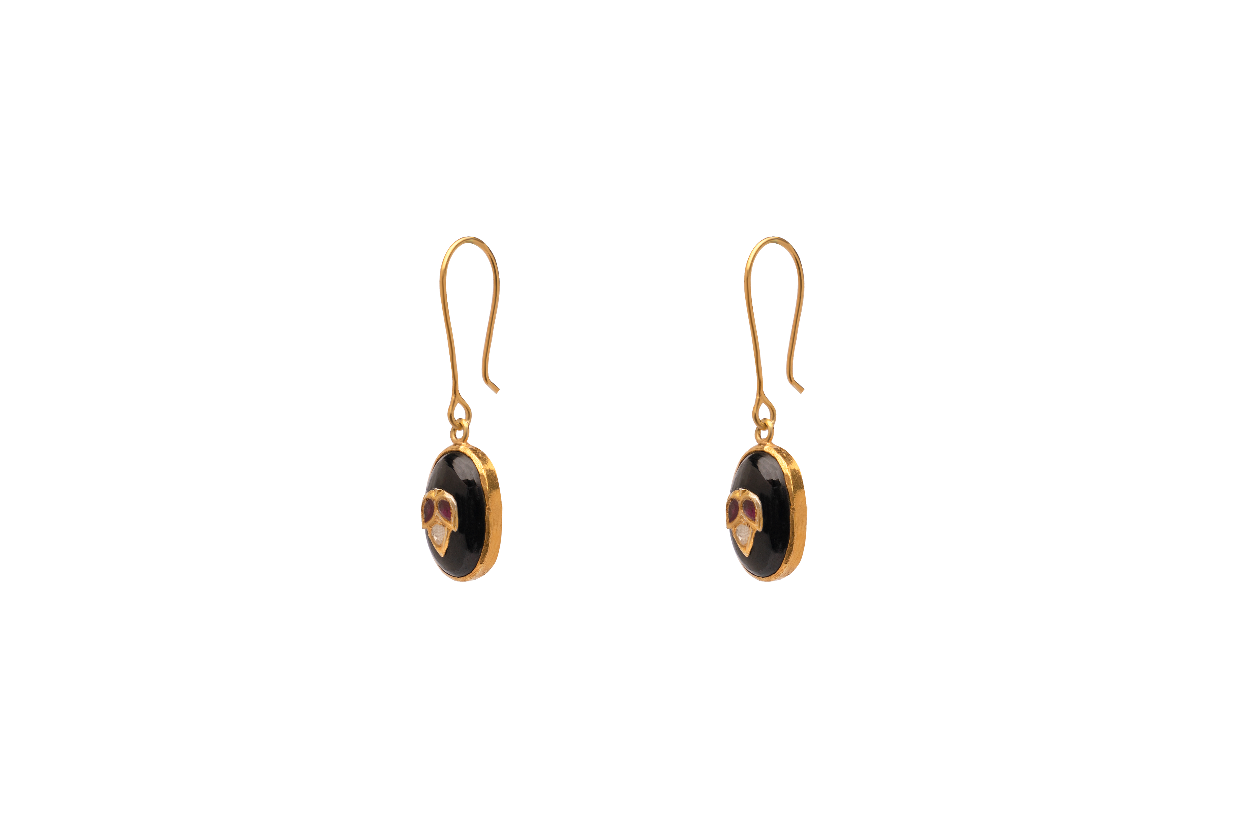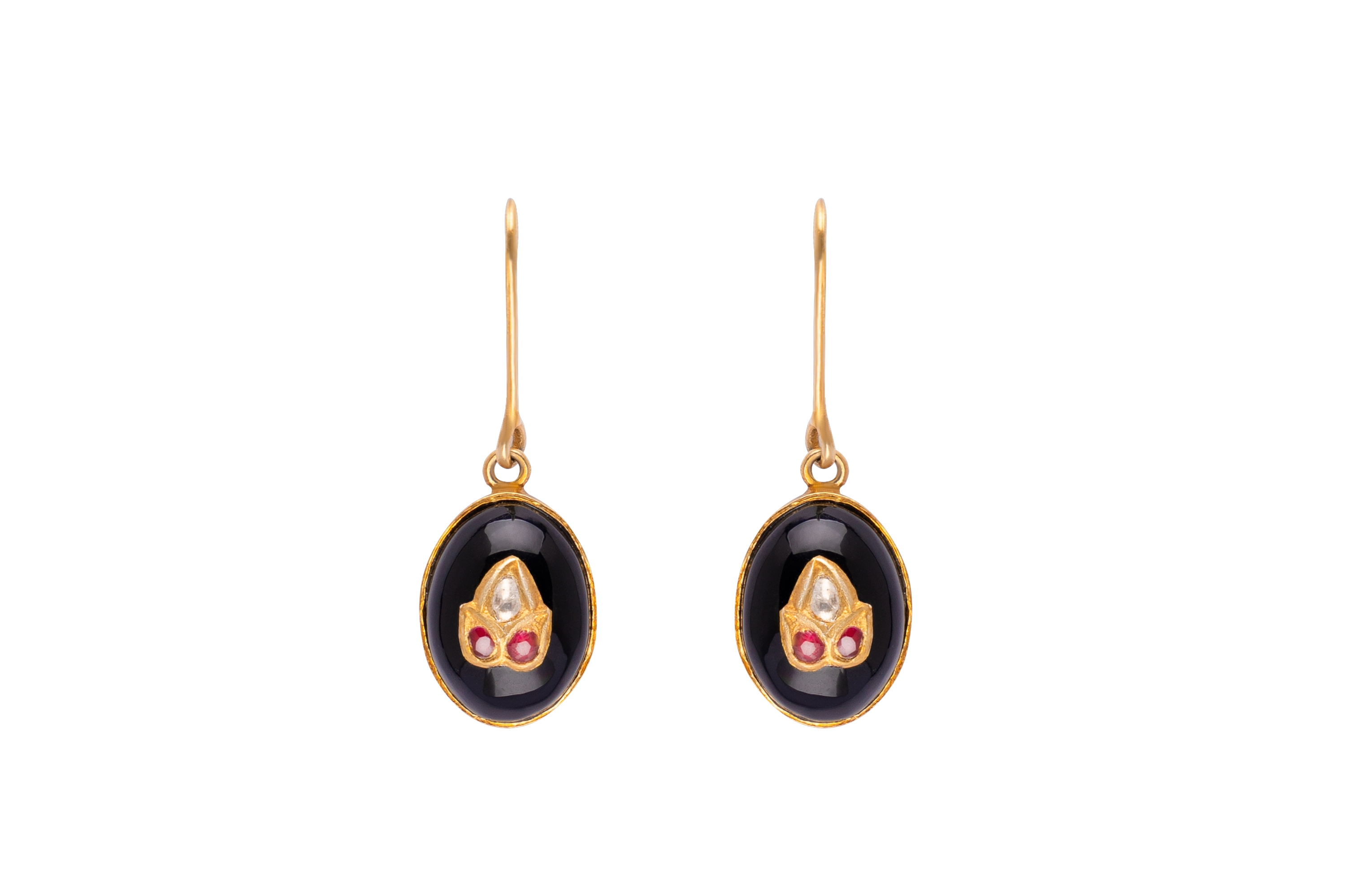 Feast your eyes upon the smooth and glossy black onyx, which charms all onlookers like a magical night. It is adorned with a glittering pattern of polki diamond and ruby, while the warm gleam of gold complements the black and red color scheme, lending a balanced finishing touch.