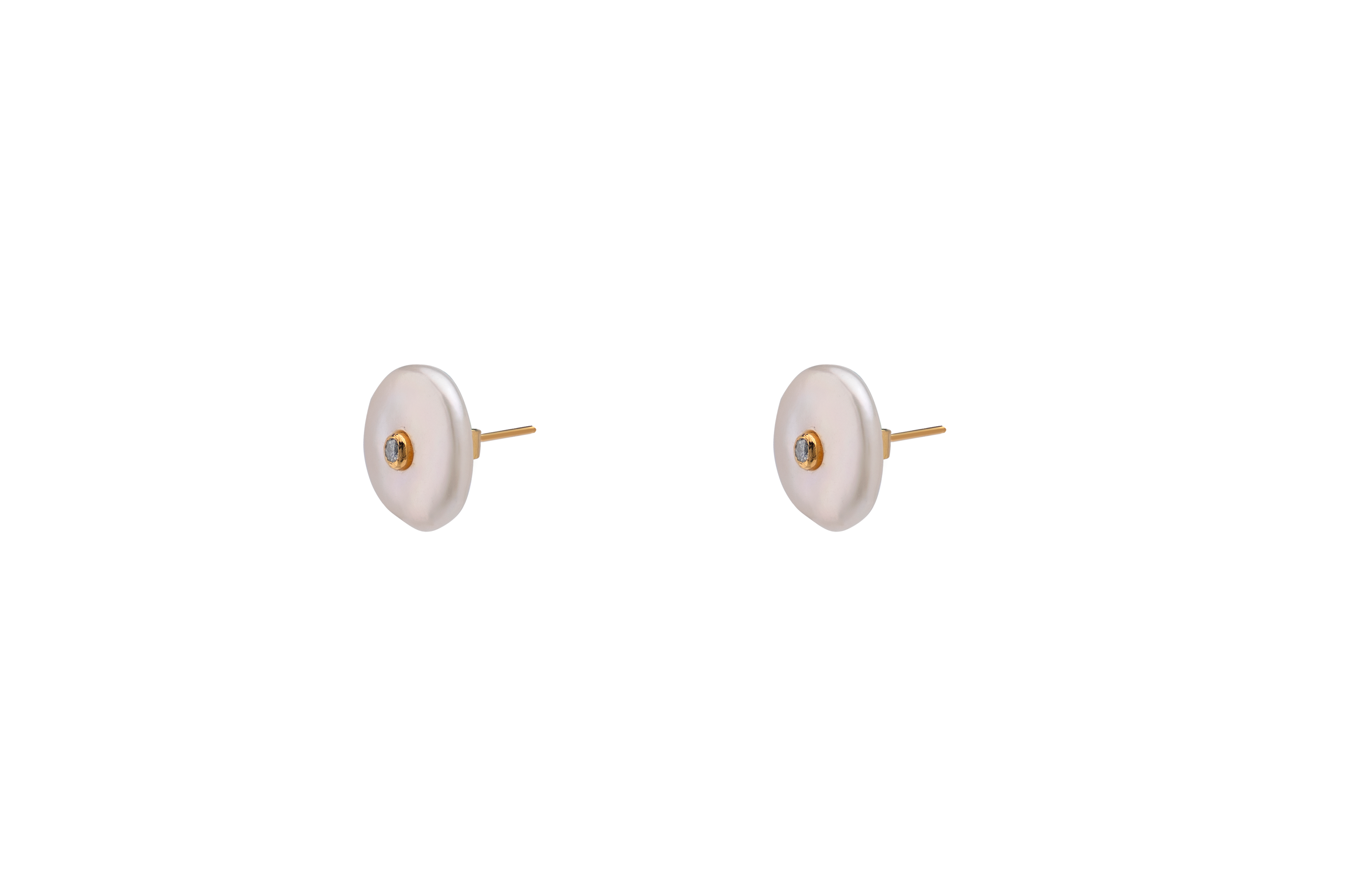 These studs balance resplendence with friendly comfort, because they are as magnificent as they are easy to wear. Glimmering diamond set in gold sits at the very center, establishing your perennial shine. The coin of white freshwater pearl glows with a peerless beauty, just like you.