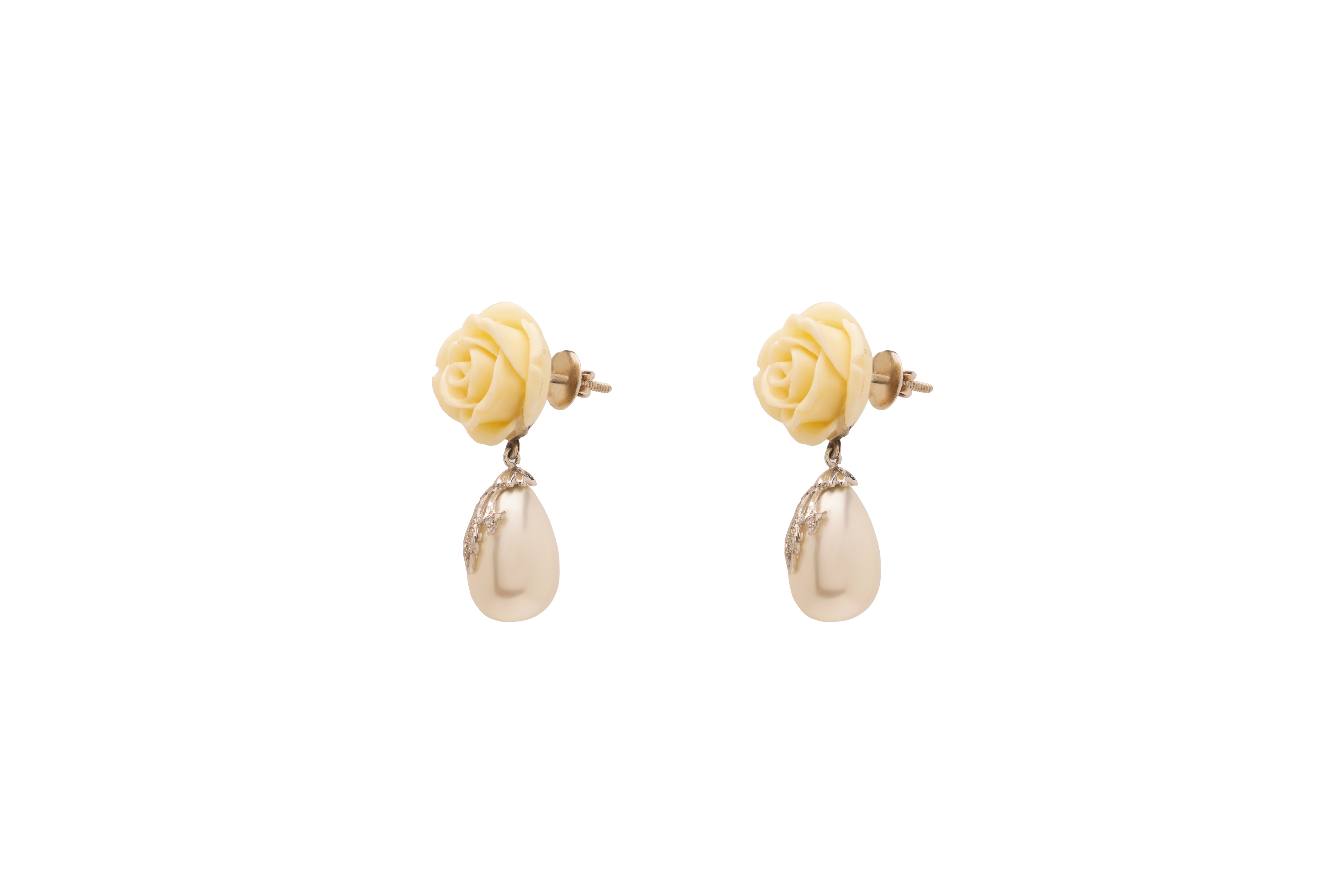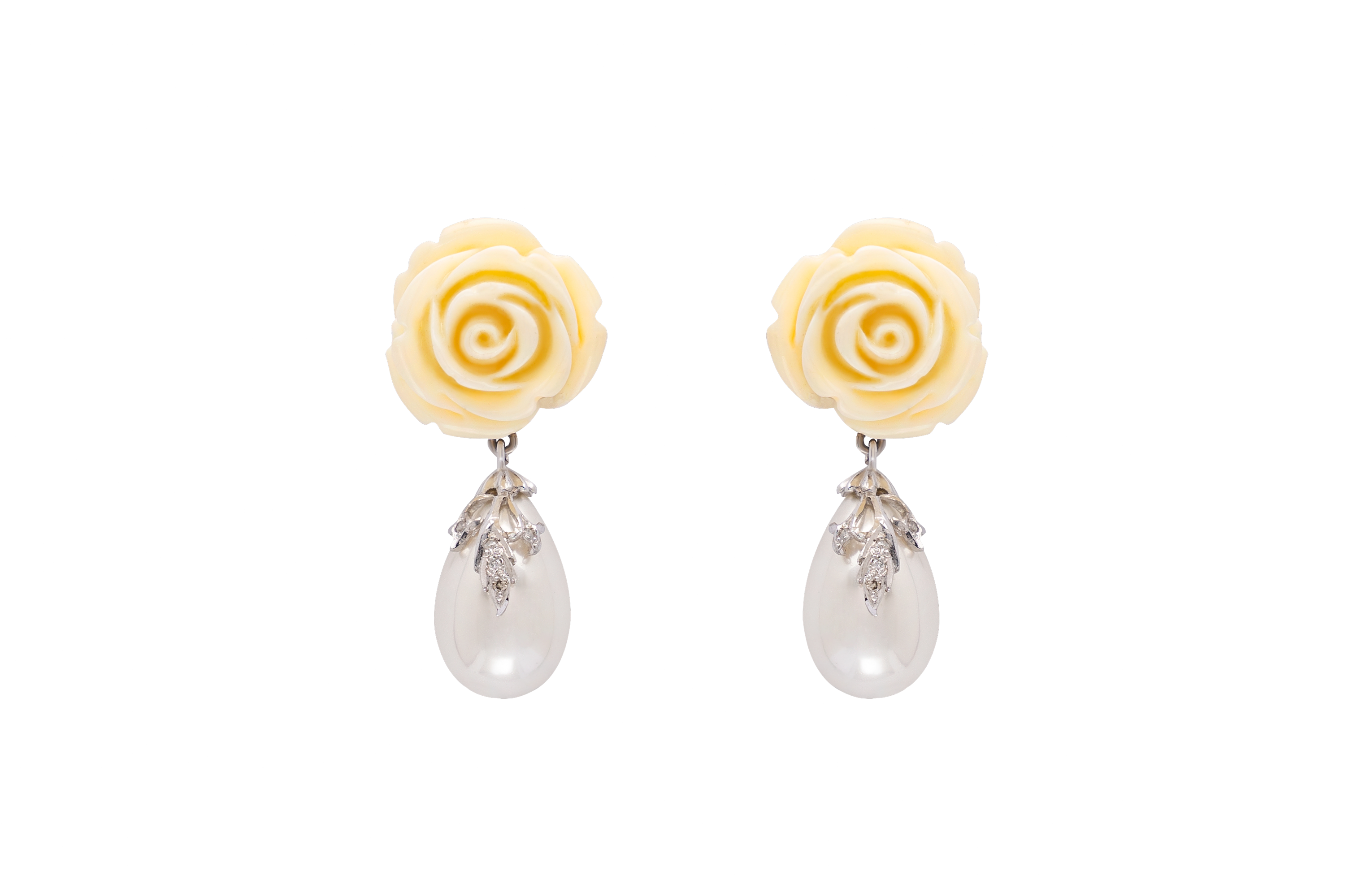 We have lovingly carved out real coral, which comes in a gentle and inviting shade of ivory, into a classic rose shape. This poetic design stirs up an appreciation for purity, natural beauty and oceanic serenity. Underneath this superbly molded blossom, there glitters a diamond-encrusted vine of leaves, which grows softly over a white teardrop pearl.