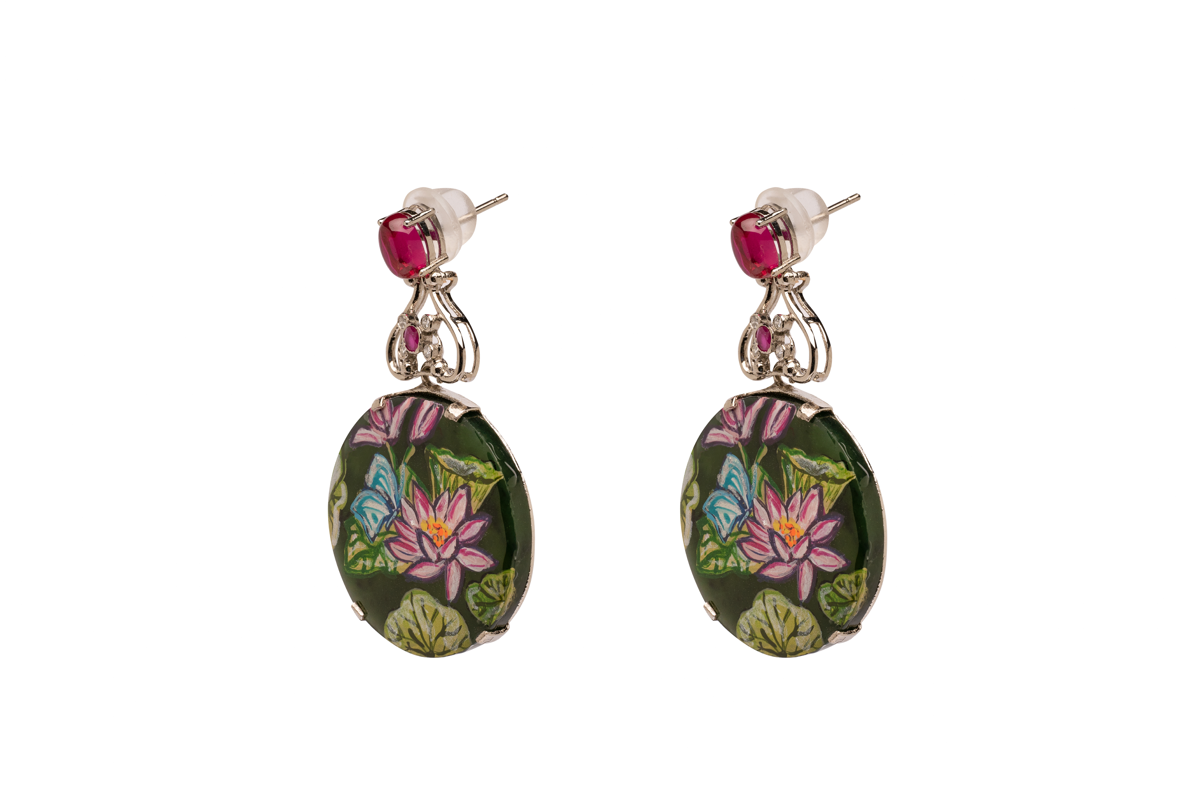 A priceless disc of jade forms the verdant canvas for the lovingly hand-painted floral scene. The water lilies frolick in the deep green lake, but that's not all: a stunning ruby glimmers at the apex of these earrings, ensuring a sense of timeless grace and elegance. So that you can always be pretty as a lily.