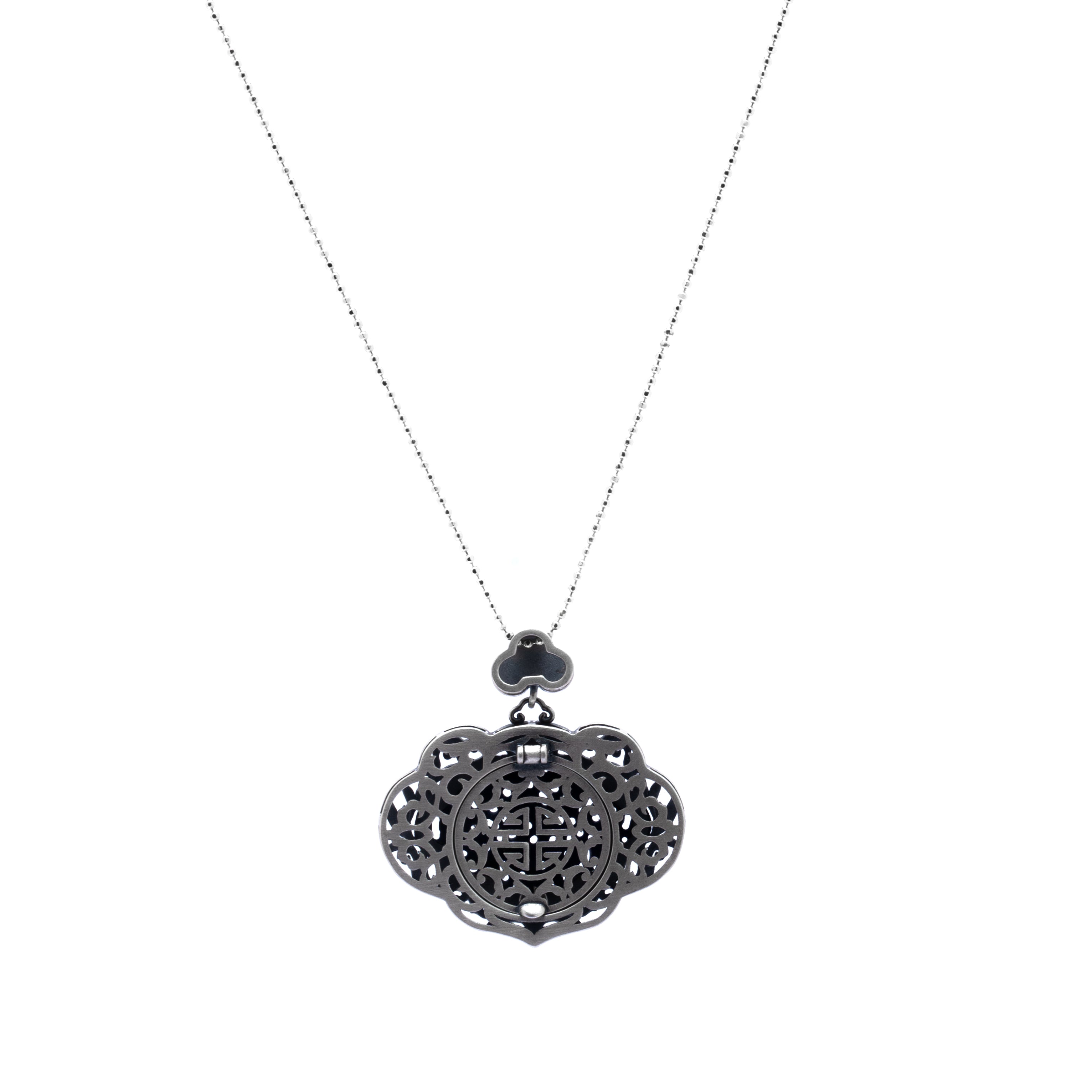 The reversible design offers dual appeal — one side showcasing the gemstone’s rich texture, and the other displaying a striking openwork silver medallion pattern. It’s a versatile and elegant piece perfect for both cultural occasions and modern styling.