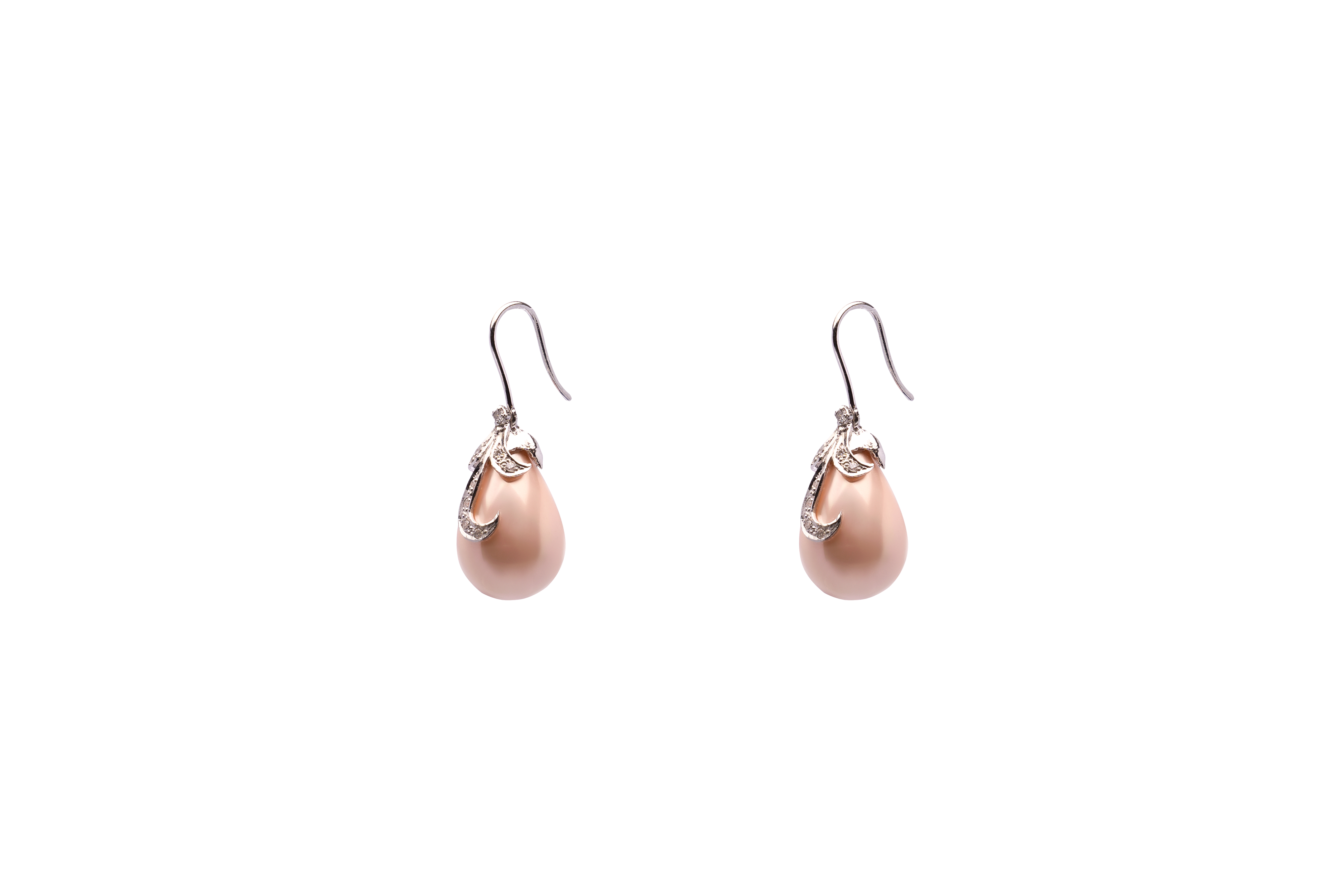 The lustrous pearl drop glows with a peachy blush, complementing your rosy cheeks and warm smile, while the sparkling diamonds add a touch of undeniable class. A shimmering diamond-studded hook also reaches halfway down the peachy pearl, further adding a bold and dynamic personality to these one-of-a-kind earrings.