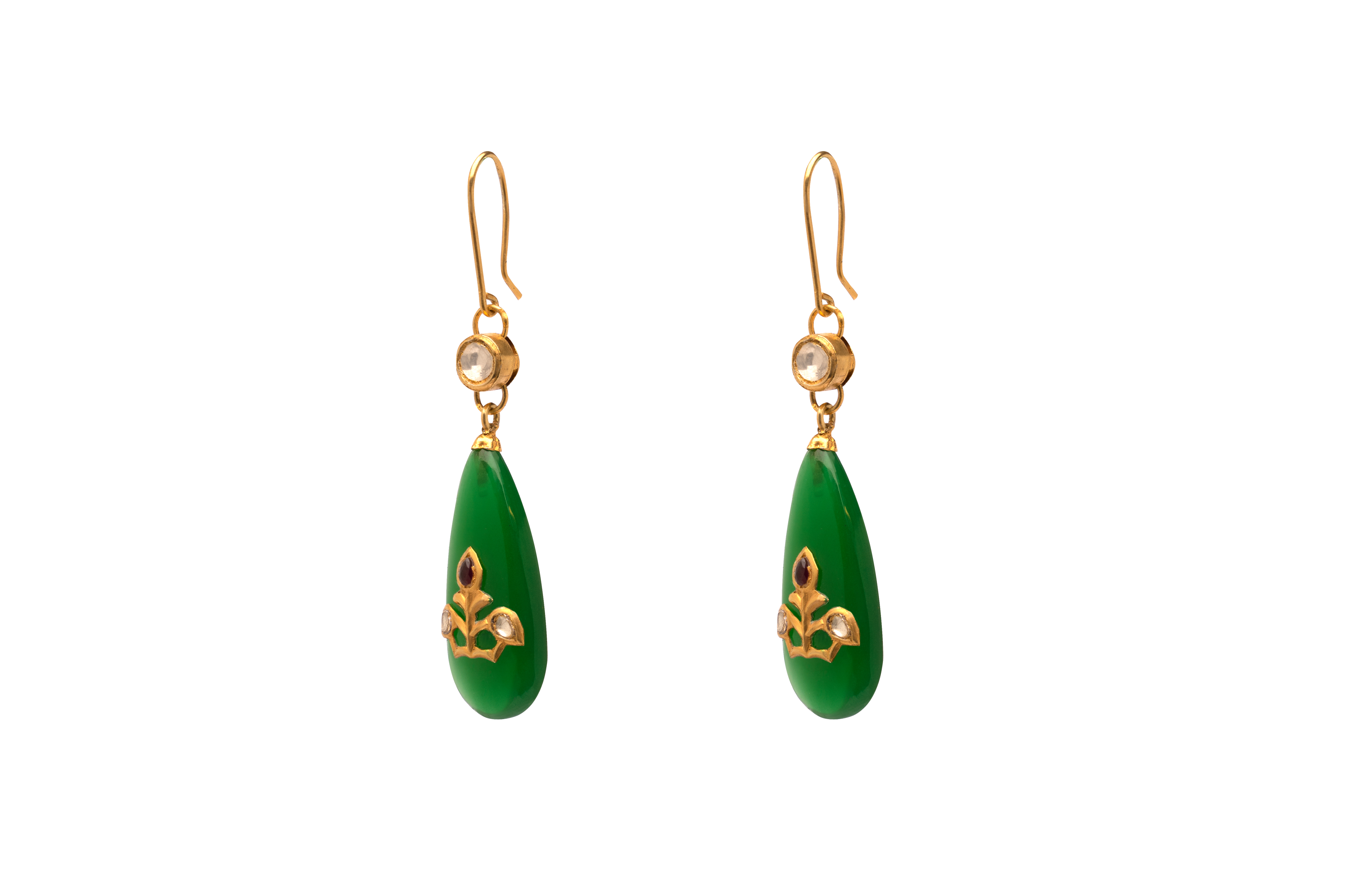 Their life-giving, fresh shade of green is the canvas for a breathtaking polki diamond design: three floral stems bursting at the centre of each onyx drop, singing a song of rich vitality. Their golden gleam is capped off by the central red bud, which is nothing less than genuine ruby. Because you deserve jewellery you can cherish for years to come.