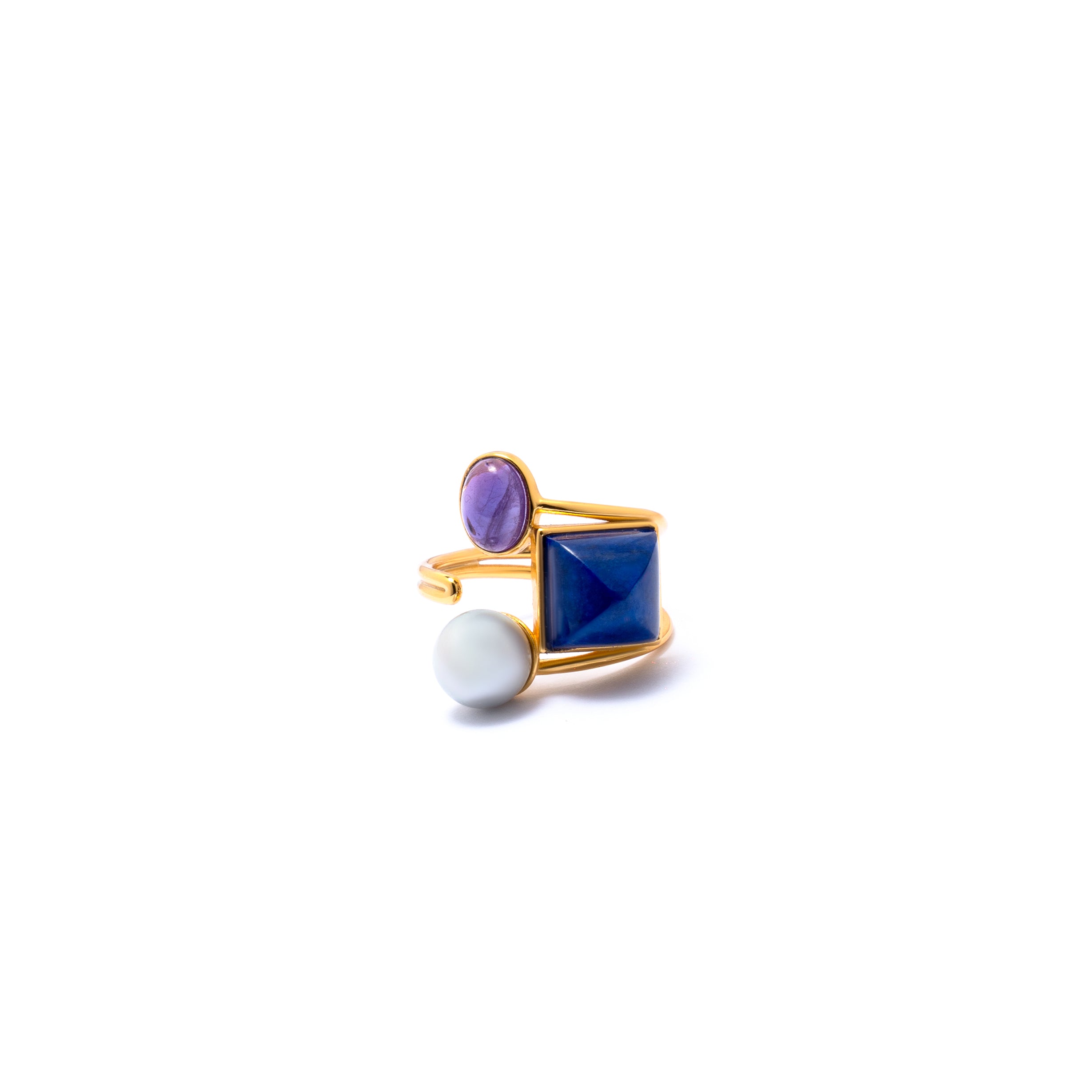 The Trio Harmony is a stunning blend of structure, symbolism, and sophisticated color. Crafted in a contemporary open band style, this ring features three powerful stones: a square-cut Lapis Lazuli, symbolizing wisdom and depth; a lustrous freshwater pearl for purity and grace; and a soft lavender amethyst representing tranquility and intuition.